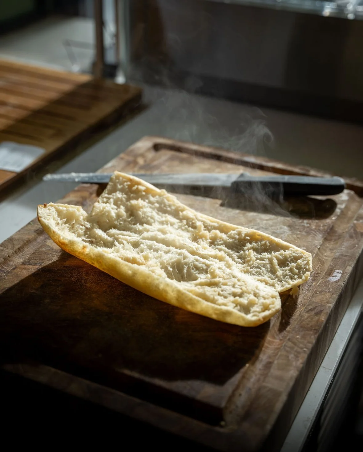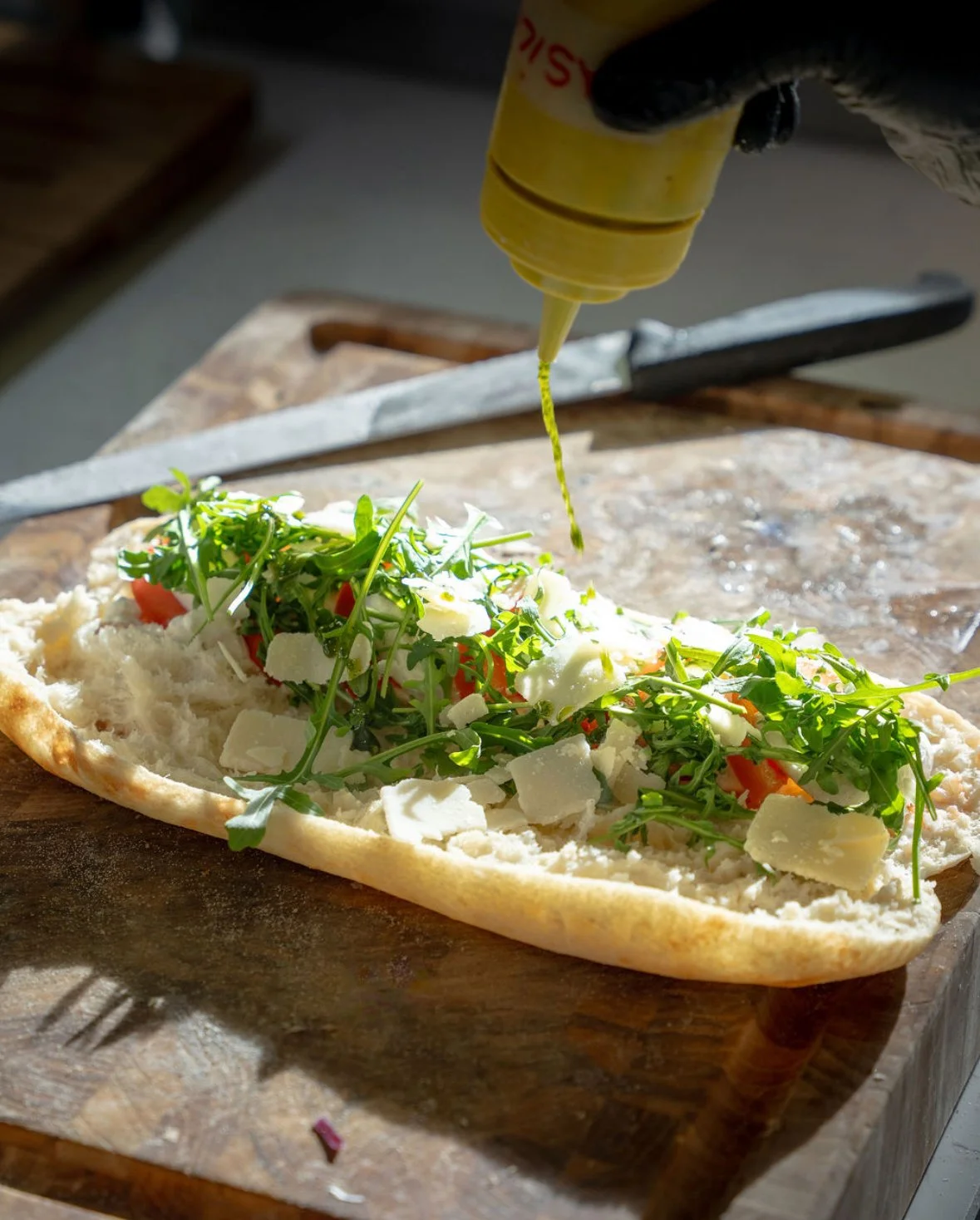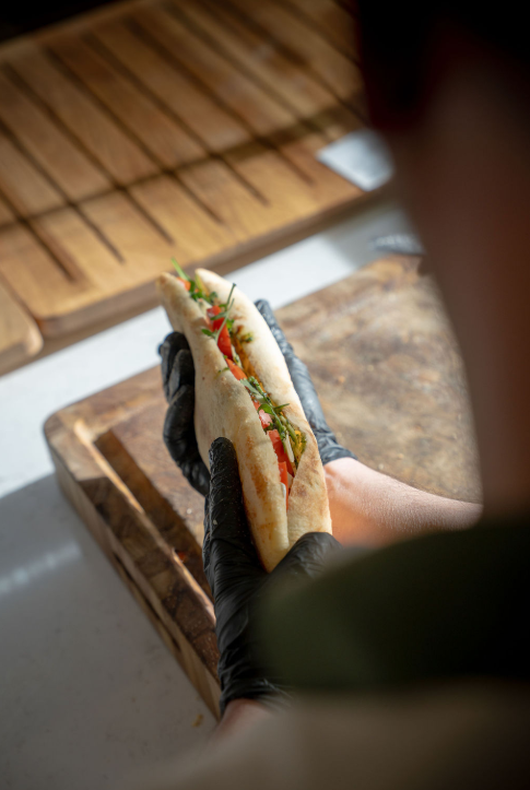 Ce pain à la silhouette allongée, façonné à partir d’une pâte proche de celle de la pizza, est cuit jusqu’à devenir doré et croustillant à l’extérieur, tout en restant incroyablement moelleux à l’intérieur. On l’ouvre encore chaud, on le garnit généreusement de produits simples et puissants, charcuteries fines, légumes grillés, fromages fondants, puis on le referme comme un trésor que l’on s’apprête à partager.